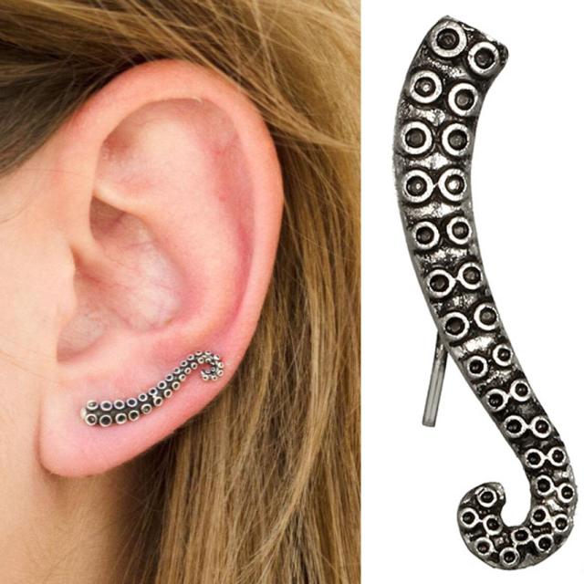 タコの足をモチーフにしたユニークなイヤーカフ。裏側の止める部分がL字型になっているので耳にはさんで使うこともできるし、ピアスホールに通して使うこともできる面白いピアス。メンズでもレディースでも使えるおもしろピアスはハロウインパーティの仮装や海賊のコスプレに使っても面白いピアスです。左右1ペア販売なのでペアルックとしたりプレゼントにも最適です。