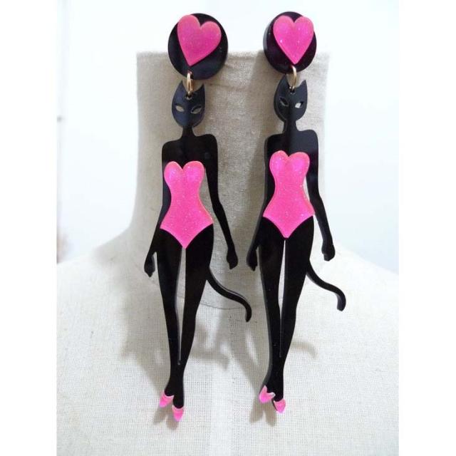 キャットガールピアス(1ペア) ねこのピアス 猫 ネコ 面白い シルエットピアス ユニーク レディース レオタードを着た猫 水着 大きいピアス ビッグ アクリルピアス 軽い プラスティック おもしろ 両耳 ピンク ハート レトロ ステージ 舞台 キャバクラ 夜 パーティー
