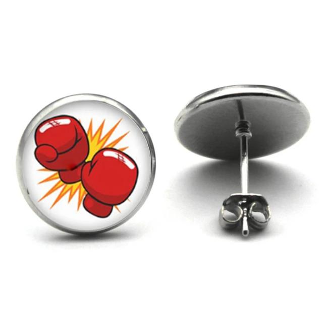 ボクシンググローブをデザインした丸いカボションをサージカルステンレス316L製のスタッドピアスにセットしたオシャレなファッションピアス。