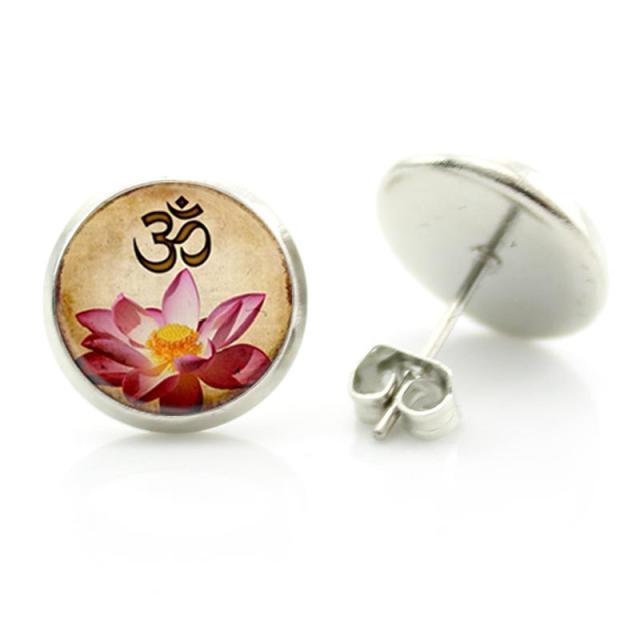 14mm カボションピアス (蓮華梵字) 1ペア 両耳 花 フラワー ぼんじ ボンジ 蓮の花 ロータス レンゲ れんげ 仏様 ブッダ ブラフミー文字 丸型 丸い カボーション 20G 20ゲージ 20g ファッションピアス スタッドピアス キャッチピアス メンズ レディース プレゼント 結婚式