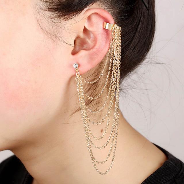 ロングチェーンレイヤーゴールドイヤーカフピアス 1個販売 ゴールド 8本 クリスタル ラインストーン ジルコニア キャッチピアス 繋ぐ つなぐ 金メッキ 揺れる チャーム レディース メンズ 女性 男性 女子 結婚式 パーティ 発表会 入学式 卒業式 イヤリング クリップピアス
