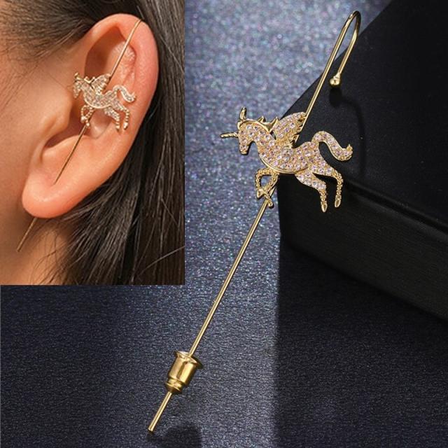 ユニコーンや一角獣にクリスタルのキュービックジルコニアが光る綺麗な金色ゴールドのイヤークローラータイプのファッションピアス。