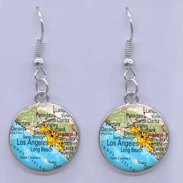 丸いカボションの台座に地図をデザインしたユニークなフックタイプのピアスです。