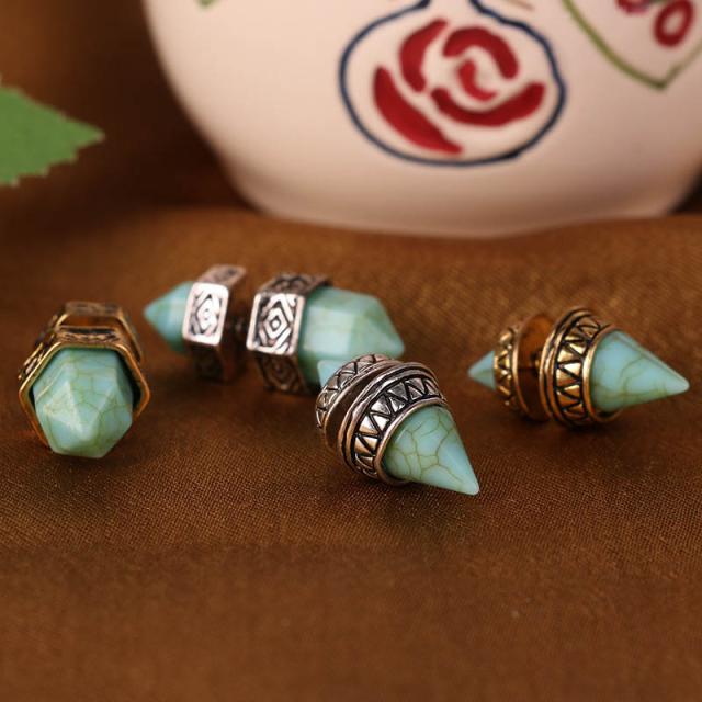 六角形のペンシル型のターコイズと三角形の円錐型のターコイズをセットしたバックキャッチピアス。エスニックな台座がボヘミアンスタイルをアシストしてくれる。メンズでもレディースでも使えるおしゃれなピアスです。プレゼントにも