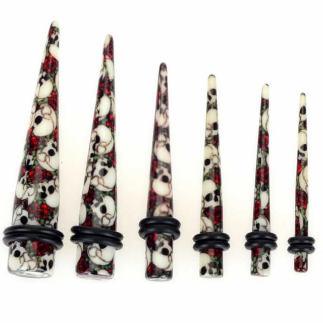 アクリル製の拡張器にドクロとバラをデザインしたボディピアス。そのままピアスとしても拡張器としても使える便利なボディピアス。素材もアクリル製なので金属アレルギーもなく、軽くてコストパフォーマンスも高い。メンズでもレディースでも使えるボディーピアスです。