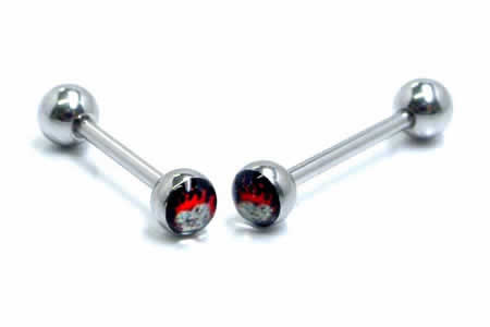 黒のキャンパスにサイコロ2つが燃え上がるハードテイスト満点のバーベルスタッドです。