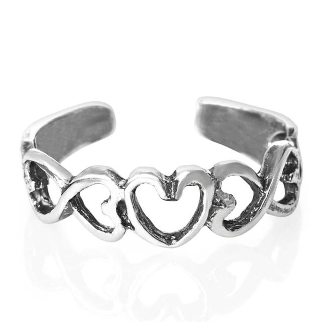フレーム型にカットアウトしたハートを色々な向きにリンクさせたオープンハートのピンキーリング・トゥリングです。 装着したときに、くりぬいた部分から肌が見えてとてもきれいでセクシーな雰囲気のシルバー925トゥリングです。 オープンハートのトゥリングは女性に人気のシルバーリングなので彼女のプレゼントにも最適のシルバートゥリングです。 サンダルやミュールに合わせて、さりげなく存在感をアピールしてくれるトゥリングです。 アンクレットとの相性もいいトーリングは、コーディネートしだい無限に広がるおしゃれを楽しめるシルバーリングです。 サイズが調整できるトゥリングは足の指輪としてだけでなく、ピンキーリングやベビーリングにも使えるお優れのシルバーアクセサリーです。 また、サイズがフリーなので、リングサイズが分からない人へのプレゼントにもオススメです。 1本は持っておきたいシルバーリングです。