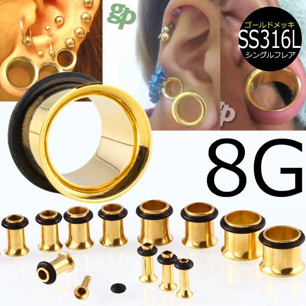 [ 8G 金色 ホールピアス ] ゴールド シングルフレア ボディピアス 8Ga 8ゲージ サージカルステンレス316L 金属アレルギー メンズ レディース 拡張 ホールトゥピアス ゴムキャッチ ラバーキャッチ 片側 広い 大きい ビッグ ラージ ホール 耳 高級 イエローゴールド