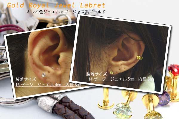タテ爪でジュエルを固定したロイヤルジュエルラブレットのゴールドモデル。綺麗色のジュエルとゴージャスなゴールドの輝きが、ワンランク上のアナタをアシストしてくれるジュエリーです。長い爪のクラウンで固定したジュエルは、輝きを存分に堪能できるだけでなく、どの角度から見てもジュエルの輝きを楽しめるので、どんな場所へのピアスにも使える。しかも、ネジ部分がジュエルに着いた逆ネジタイプなので、ピアスホールを傷つけにくく、肌に優しいピアスはファーストピアスにも最適。内径やゲージが選べるのはもちろん、ジュエルカラーだけでなく、なんと、ジュエルサイズまでも選べるので、自分のスタイルに合ったピアスライフが楽しめるジュエリーです。有名人も愛用のヘリックスやトラガスに使ったり、耳たぶに普通のピアスとしても使える最高の逸品!
