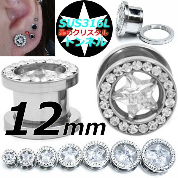 [ 12mm 星型のクリスタル トンネル ] スターリングトンネル 12.0mm ボディピアス サージカルステンレス316L キュービックジルコニア CZ キラキラ 高級 低アレルギー メンズ レディース ラインストーン ネジ型 ネジタイプ スクリュー 埋め込み型 埋込 ハーフインチ