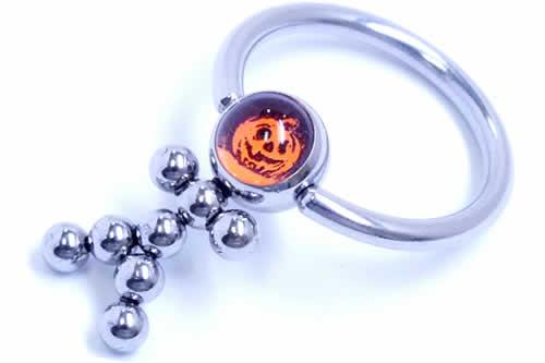 ハロウィンカボチャをデザインしたボールに人型のボールをデザインした100%ハロゥインを意識した(笑)ハロゥイン期間中だけ買える期間限定ボディピアス。ハロウィーンパーティには欠かせないかぼちゃのお化けをモチーフにしたユニークなビーズリング。ハロゥインカボチャを人型にすることで、見る人を笑わせるパーティには欠かせないボディーピアス。今にも動き出しそうなカボチャのオバケは思わず2度見しちゃう。毎年秋しか買うことが出来ないハロウインボディピアスは、絶対にゲットしたい!パーティだからこれぐらい派手がちょうどいい。耳たぶはもちろん、ヘリックスやへそピアスなどなど色々な場所へのピアッシングに使えます。