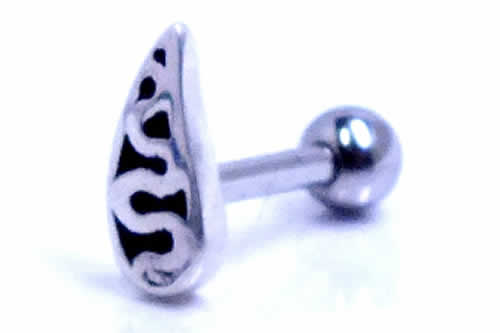 流線型のシルバー925製の台座にヘビをモチーフにしたトライバルをデザインしたクールなヘリックスピアス。デサイン部分を高級感のあるシルバー925で製作し、耳に入るシャフト部分は低アレルギーのサージカルステンレスで仕上げたヘリックスピアスは、幅広く使えるお奨めのボディピアスです。人気のヘリックスをオシャレなピアスで飾ろう!もちろん、ヘリックスのピアスとしてだけでなく、耳たぶにも使える。プレゼントにもお奨めのジュエリーです。