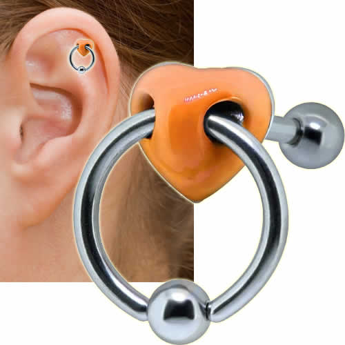 カラフルなオレンジ色のハートにビーズリングを通した個性的なヘリックスピアス。ビーズリングは取り外しできるので、他のパーツをつけても楽しめるオシャレさんにオススメのボディピアスです。もちろんヘリックスピアスとしてだけでなく、耳たぶやトラガス、クチピアスにも使える。男女を問わず装着できるの犬好きのカップルにもオススメ!