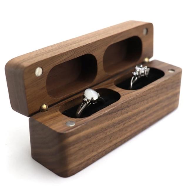 木製の高級感のあるボックスに指輪2本をディスプレイできるウレタンをセットしたペアリングや結婚式、告白のサプライズにぴったりのおしゃれなウッド調のラッピング用ギフトボックス。