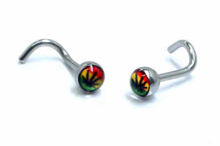 赤・黄・緑のラスタカラーに黒で描いたマリファナの葉がとてもクールな鼻ピアスです。アクセサリーの中でも人気の高いガンジャとラスタカラーをドッキングさせたカジュアルなボディピアスです。男女を問わず幅広い層に支持されているオススメのボディピです。他に、バーベルスタッド、バナナバーベル(へそピアス)、スパイラルバーベル、キャプティブビーズリング、ラブレットがあります。