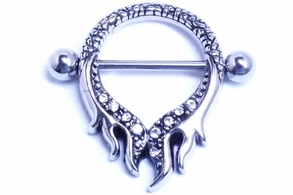 火竜をモチーフにしたニップルジュエリー。高級感のあるクリスタルのジルコニアとサージカル製のシールドが存在感を遺憾なく発揮してくれる乳首ピアス。セットのバーベルはもちろんサージカルステンレス製で、両側のボールが取り外し可能なので装着もしやすい。サージカルステンレス製のシールドは少しお値段は張りますが、長く着けていても安心だし、メッキがはがれる心配もなく、ずっと愛用できる。バーベルとの色合いも同じ素材なので綺麗な統一感が楽しめる。素材感だけでなく、精巧な作りも見事なニップルボディピアスです。