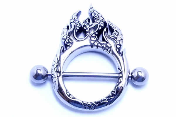 火の玉と竜をモチーフにしたニップルジュエリー。高級感のあるサージカル製のシール ドが存在感を遺憾なく発揮してくれる乳首ピアス。セットのバーベルはもちろんサージカルステンレス製で、両側のボールが取り外し可能なので装着もしやす い。サージカルステンレス製のシールドは少しお値段は張りますが、長く着けていても安心だし、メッキがはがれる心配もなく、ずっと愛用できる。バーベルと の色合いも同じ素材なので綺麗な統一感が楽しめる。素材感だけでなく、精巧な作りも見事なニップルボディピアスです。