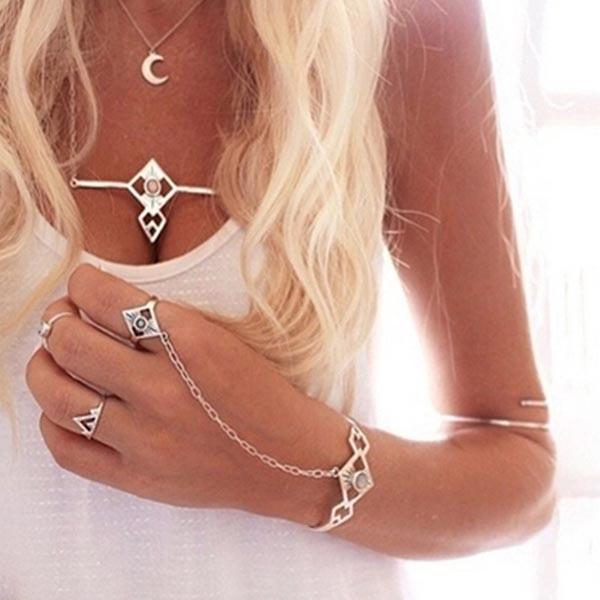バングルと指輪をつなげたボヘミアンスタイルのフィンガーブレスレット。メンズでもレディースでも使えるスタイリッシュなデザインが好き。シンプルきれいにもエスニックにも合わせてコーデできる。プレゼントにもおすすめです。