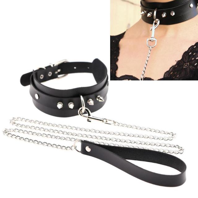 トゲトゲのパンクなパーツを黒のネックレスにつなぎ、鎖で手綱につないだまるで犬の首輪のようなリード付きネックレス。SM風のボンデージファッションは男女を問わず流行。レザーチョーカーがゴスロリファッションにもぴったり。幅の広いフェチなレザーネックレス。犬の首輪のようなユニークな女友達同士で楽しめるフェチなアイテム。手綱のクサリチェーンは取り外しが可能なので、鎖を外しても使えます。