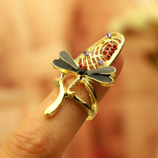 水辺をイメージさせる透かしのネイルリングに蜻蛉をデザインしたオシャレなネイルリング。散りばめたビジューが高級感を醸し出す。