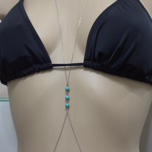 シルバーのボディチェーンにターコイズビーズをセットした夏らしいネイティブ系ボディチェーン。スタイリッシュなデザインで大人カジュアルを演出してくれるボディチェーン。水着やヘソだしガーリーに合わせてコーデしたり、秋冬はドレスに合わせてもOK。