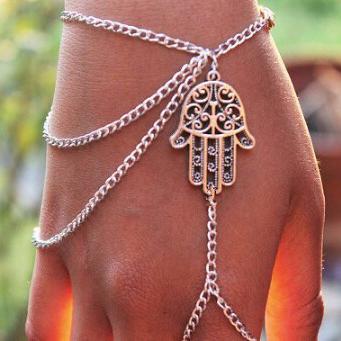 ハムサをデザインした指輪とブレスレットをつなげたネイティブ感満点のフィンガーブレスレット。ボヘミアンスタイルをアシストする夏のアイテム。オシャレで上品、オトナの遊び心満載のアイテムです。