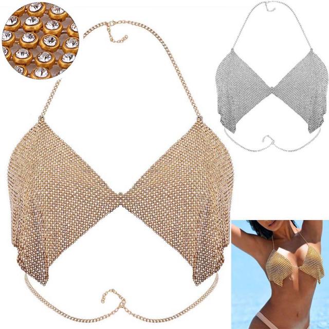 クリスタルビキニボディチェーン クサリ ブラジャー ブラトップ キャミソール 洋服 水着 鎖 ジルコニア ラインストーン 面白い オモシロ ネックレスチェーン ベリーダンス レディース ベリーチェーン ボディージュエリー 胸 首 ゴールドチェーン シルバーチェーン
