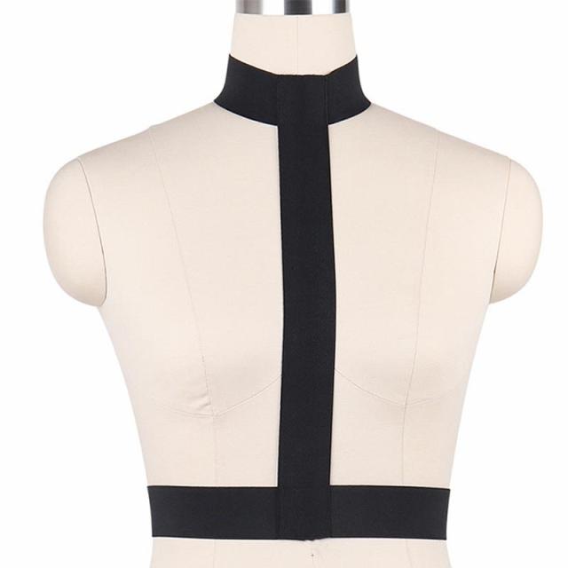 幅のあるワイドな黒いハーネスベルトのネックレスとウエストをつなげたボンテージハーネス。