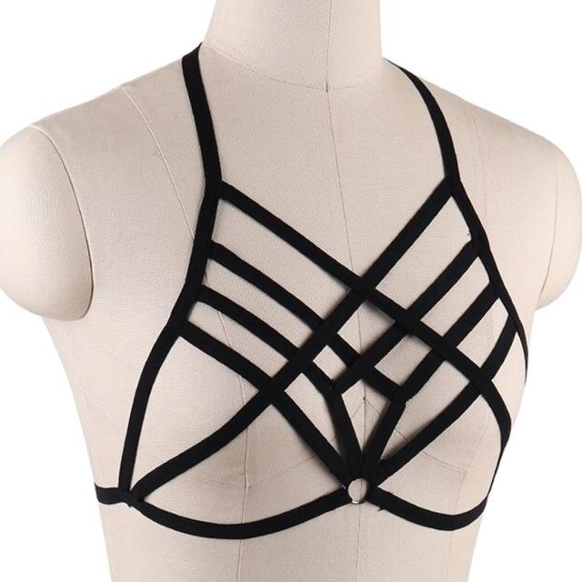 黒い伸縮性のあるポリエステル製のボンテージ風ハーネス。大人セクシーで下着のようなフェチなボディチェーンは個性的なボンデージファッションにぴったり。ユニークな女友達同士で楽しめるフェチなアイテム。