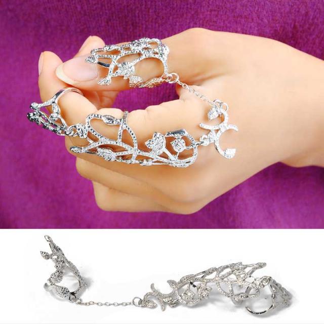 指を覆うアーマーリングとファランジリングをチェーンでつなげた存在感のある指輪です。高級感のあるビジューが指元で輝く。プレゼントにもオススメのビジューリングです。