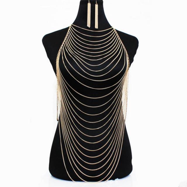 ゴールドのドレッシーなチェーンが高級感を発揮してくれるボディチェーンとピアス1ペアをセットにしたアイテム。