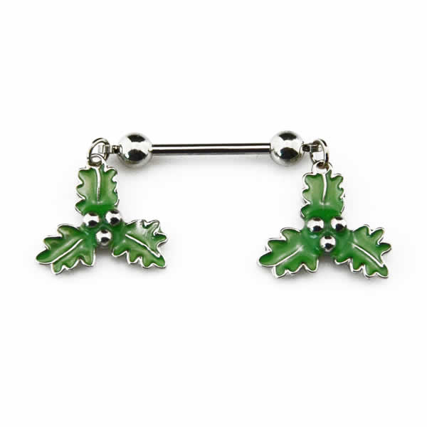 ヒイラギの葉をモチーフにしたチャームが揺れるニップルボディピアス。クリスマスプレゼントにも最適なニップルピアスは、思わずサンタクロースもうっとり!乳首のピアスだけでなく、耳に付けてもかわいい。