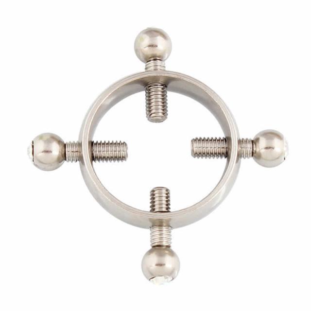 ステンレスリングにネジを四つセットしたニップルクランプ。ねじを締めることで乳首をプレスしピアスを固定するニップルプレッシャー。シンプルだけど存在感のあるニップルクランプ。乳首にピアスが開いていなくても装着できるので、誰でもが楽しめる。プレゼントにもおすすめ!他の使い方もいろいろ考えたい。もちろん素材も安心のサージカルステンレス。