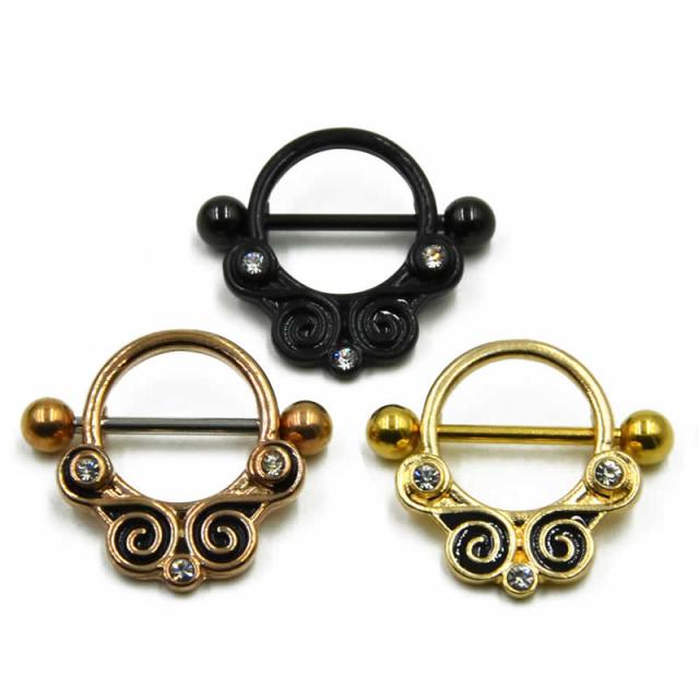エスニックなスタイルのニップルバーベル。メンズでもレディースでも使えるおしゃれなデザインと、カラーバリエが人気。セットしたクリスタルが高級感をプラス。ペアやプレゼントにもおすすめの乳首ジュエリー。