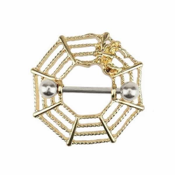 金色の蜘蛛の巣をモチーフにしたニップルボディピアス。高級感のある黄色のクモが存在感を発揮してくれる乳首ボディピアス。メンズでもレディースでも使えるボディピアス。プレゼントにもおすすめです。