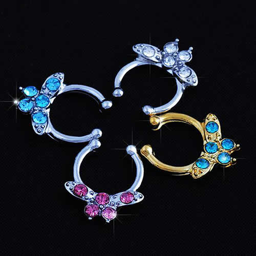 チョウチョウをモチーフにしたフェイクリング。蝶の羽にビジューをセット。ピアスホールを開けずに装着できるクリップノーズセプタムリング。クリップ型なので、セプタムの位置だけでなくノーズリングとしてもイヤーカフとして耳にも、ニップルクリップなどいろいろなフェイクピアスに使えます。カラーも豊富でスタイルによって装着できる。ピアスを開けていなくても簡単に装着できるので、プレゼントにも!海外セレブの間でも話題のセプタムリングです。