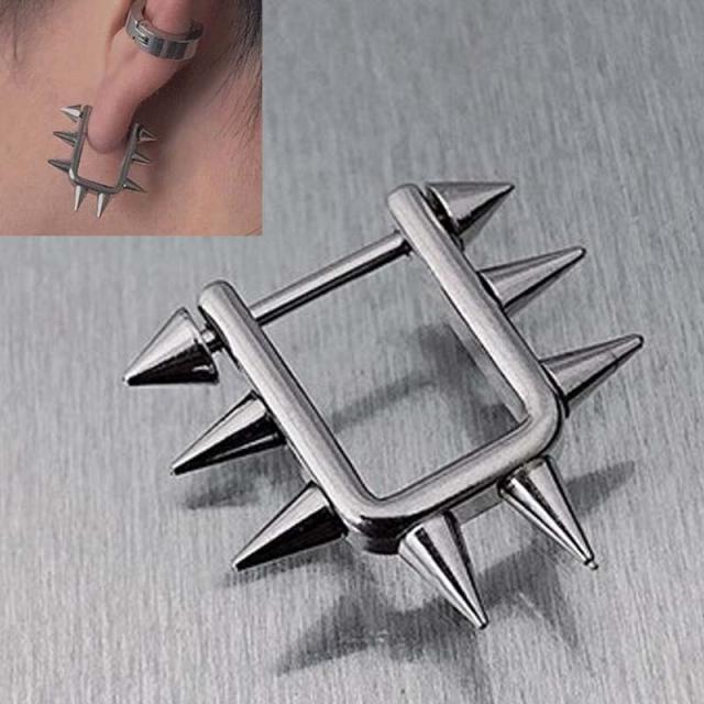 長方形の四角いステンレス製のシールドにトゲトゲのスパイクをセットしたカフ型のシールドに両側にコーンパーツをセットした16Gのストレートバーベルを通したパンクロックな軟骨や乳首にぴったりのボディピアス。