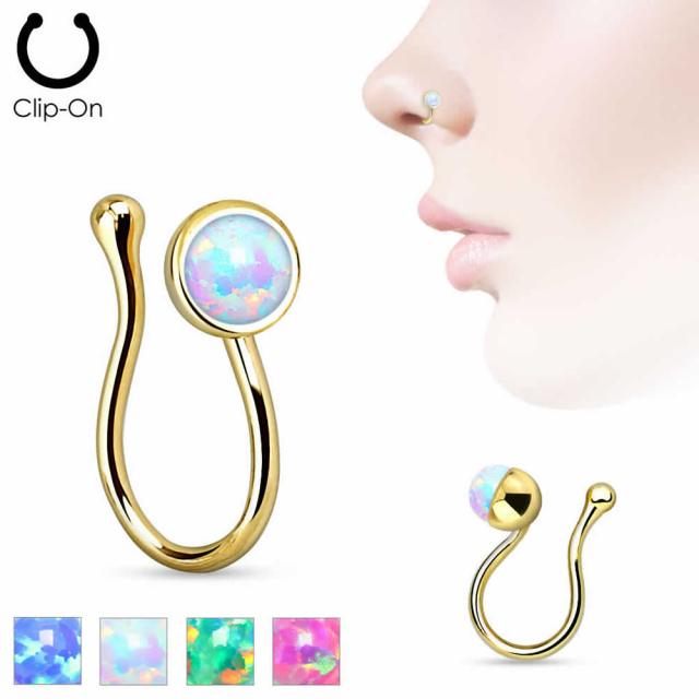 合成オパールをセットした綺麗な色合いのクリップ型フェイクピアス。鼻ピアスが開いていなくても挟むだけで簡単に装着できるので、耳に挟んでイヤーカフとしても使えます。プレゼントにもおすすめで、色々な場所へのフェイクピアスとして使えます。