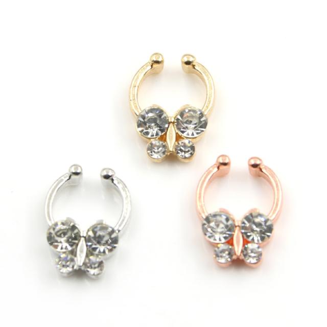 蝶々をデザインしたバタフライフェイクリング。ピアスホールを開けずに装着できるクリップノーズセプタムリング。クリップ型なので、セプタムの位置だけでなくノーズリングとしてもイヤーカフとして耳にも、ニップルクリップなどいろいろなフェイクピアスに使えます。カラーも豊富でスタイルによって装着できる。ピアスを開けていなくても簡単に装着できるので、プレゼントにも!海外セレブの間でも話題のセプタムリングです。