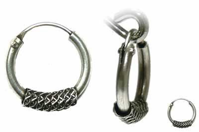 蛇のうろこのようなざらついたデザインをほどこしたプレートをフープのトップに何回もまきつけたハードテイスト満点のピアスです。絶妙な質感がとても見事!!