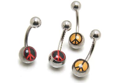 黄色地に黒で描かれたピースマークと、黒字に赤で描かれたピースマークのヘソピアス。