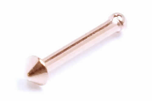 ピンクゴールドメッキされたコーンタイプの鼻ピアス。シャフトが真っ直ぐのノーズボーン(ノーズスタッド)タイプなので、装着もしやすく、ファーストピアスにも使えます。リッチな気分にさせてくれるピンクゴールド鼻ピアスは、プレゼントにもお奨め。