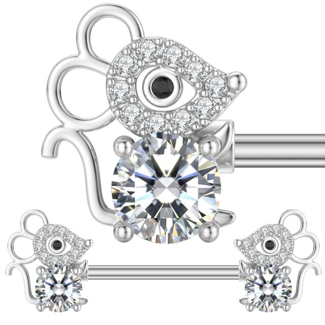 [14G ボディピアス] マウス ストレートバーベル 1個販売 鼠 ネズミ ジュエル クリスタル ストーン 石付き 動物 アニマル 14ゲージ サージカルステンレス316L メンズ レディース ボディーピアス ヘリックス 軟骨 ニップル 乳首 プレゼント 銀色 シルバー