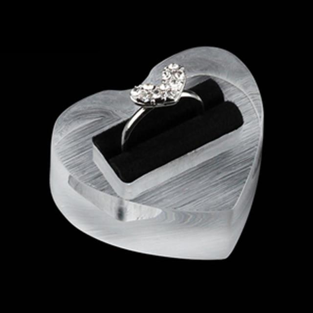 透明のアクリルのハートの台座に黒色の指輪をセットできるウレタンをセットした指輪を飾るのにぴったりな指輪用ディスプレイ。