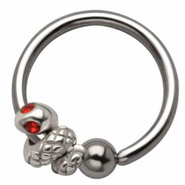 16ゲージのキャプティブビーズリングにシルバー925製のジュエルの目をした蛇が絡みつくプチハードテイストなボディピアス。小さいながらも高級感のあるシルバー925製のチャームが存在感を発揮してくれるボディーピアスです。ゴージャス過ぎるのは会社や学校につけていけないけど、普通のビーズリングでは物足りないって思ってたあなたにぴったりのおしゃれ心をくすぐるボディピアスです。この大きさなら、男女を問わず装着でき、耳たぶやヘリックス、アイブローやニップルなどなど、いろいろな場所に使えるボディピアスです。チャーム部分はいつでも外せるので、スタイルによって簡単にコーディネートを変えることが出来る。プレゼントしてもきっと喜んでもらえるボディピアスです。