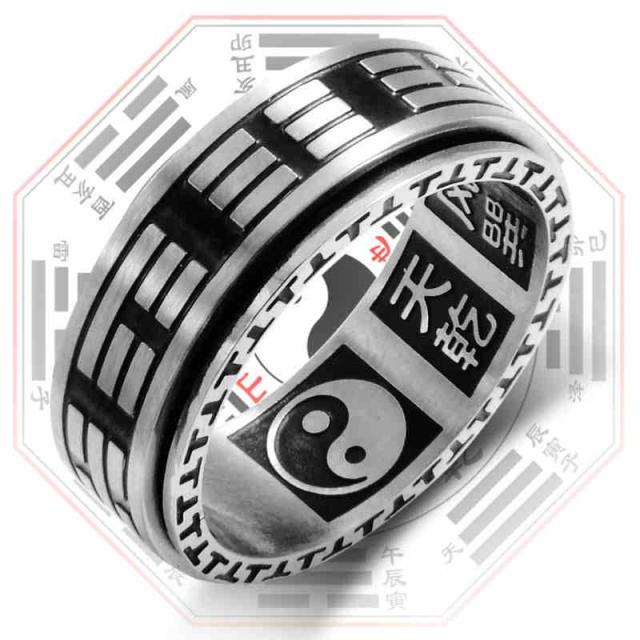 クルクル回る表面に八卦をデザインし、指輪の内側には陰陽マークのロゴと漢字をデザインしたスピナータイプのサージカルステンレス316L製の指輪。