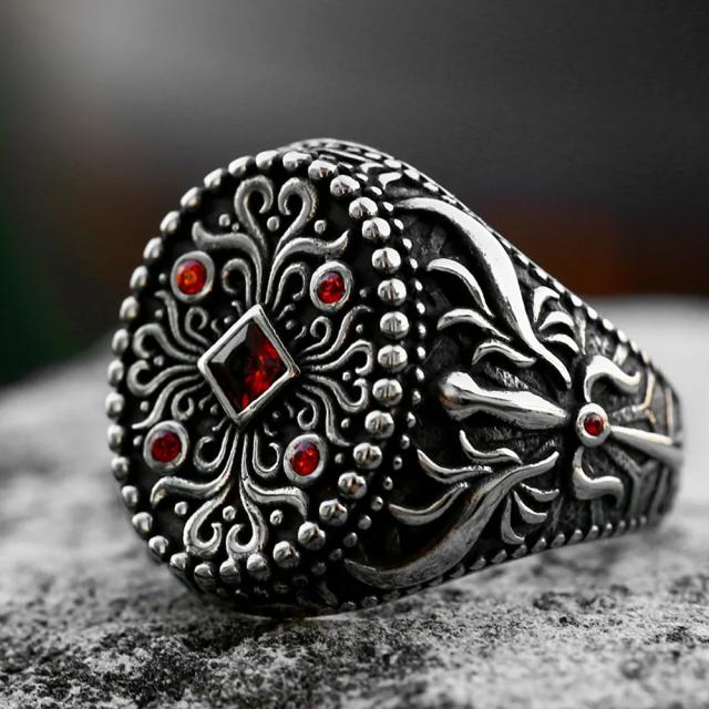 レッドキングエンブレム ステンレスリング(XRB021)サイズ/23号/25号/28号/31号 銀色 シルバー 印台型 楕円形 オーバル型 赤色 ジュエル 石付き ストーン キュービックジルコニア 四角形 スクエア 丸型 ラウンド 指輪 サージカルステンレス316L メンズ レディース