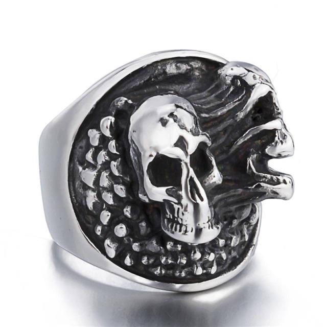 分裂した2体のドクロをモチーフにした面白いステンレスリング。まるで幽体離脱したような不気味なガイコツの指輪は彼氏や父の日のプレゼントにも最適のステンレスリング。