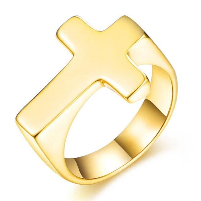金色のゴールドメッキした指輪の上に十字架が横になった面白いデザインのサージカルステンレス316L製のステンレスリングです。