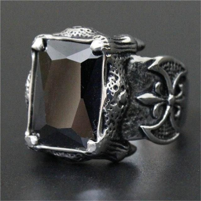 大きな黒色の四角いジルコニアを悪魔の爪をモチーフにした印台型の指輪にセットした不気味でクールなステンレスリング。